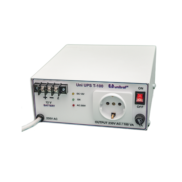 A T-100 szünetmentes tápegységünk (UPS) hálózati áramkimaradás után is folyamatos működést biztosít akár 100 W teljesítményű terhelések esetén 230 V/50 Hz feszültséggel. A kimeneti feszültség alakja módosított szinuszhullám.